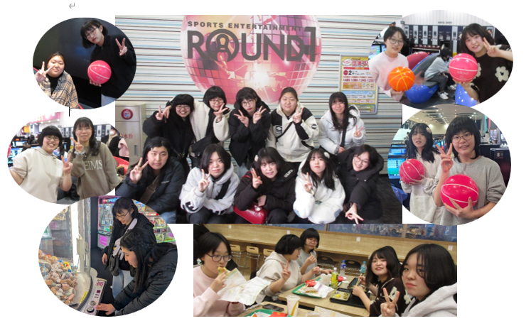 ラウンドワンではみんなでボウリングをし、ストライクやスペアが出るとハイタッチをして喜び合いました。自由時間では買い物をしたりプリクラやクレーンゲームをしたりと思い思い楽しみ、シーナシーナのフードコートで好きな物を食べてきました。