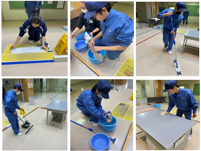 2学年流通・サービスの清掃分野の授業に成商ビル管理株式会社青森支店より2名の講師をお招きし、2年1組の生徒6名が床とテーブルの清掃を学びました。清掃用具の使い方や清掃時の注意事項等、現場で役立つ技術を直接指導していただきました。生徒自身も、教わった技術を実践しながら練習に取り組み、より丁寧で効率よく清掃することができていました。この学びを生かして頑張ってほしいと思います。